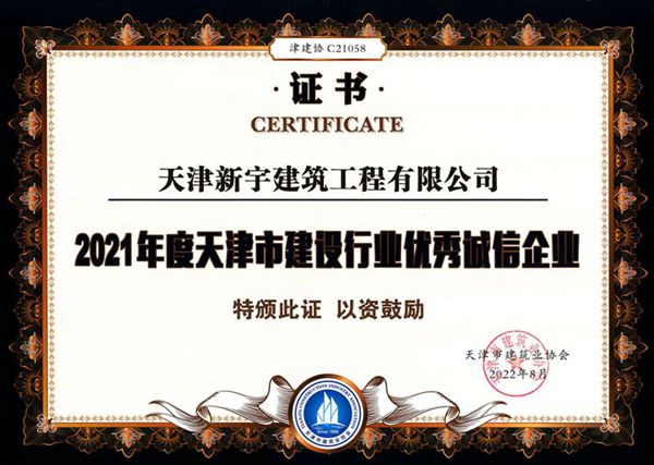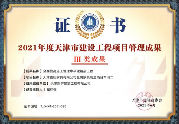 天津鑫山家具有限公司金属家具制造项目车间二荣获2021年度天津市建设华体会huatihui(中国)项目管理成果证书