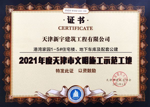 港湾家园1-5#住宅楼、地下车库及配套公建荣获2021年度天津市文明施工示范工地