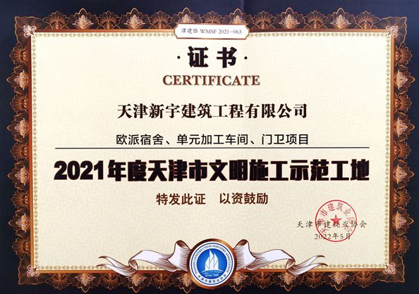 欧派宿舍、单元加工车间、门卫项目荣获2021年度天津市文明施工示范工地
