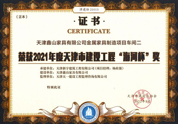 天津鑫山家具有限公司金属家具制造项目车间二荣获2021年度天津市建设华体会huatihui(中国)海河杯奖