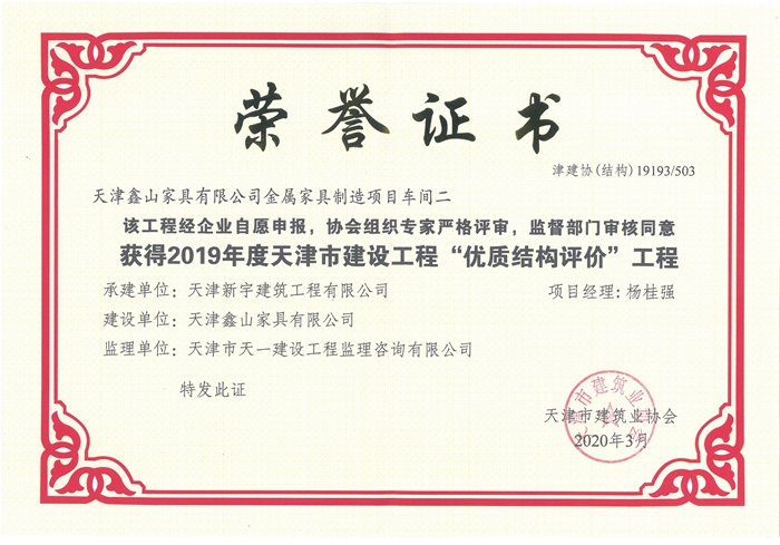 天津鑫山家具有限公司金属家具制造项目车间二获得2019年度天津市建筑华体会huatihui(中国)”优质结构评价“华体会huatihui(中国)
