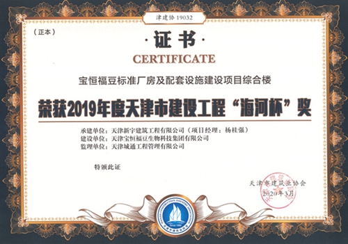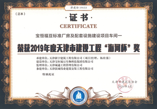宝恒福豆标准厂房及配套设施建设项目车间一荣获2019年度天津市建设华体会huatihui(中国)“海河杯”奖