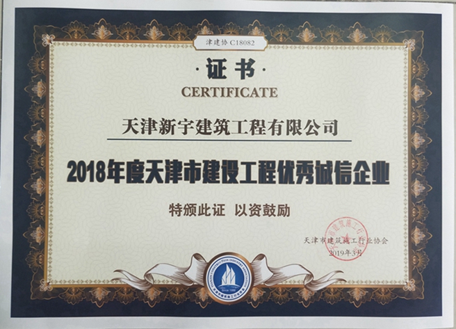 我公司被评为2018年度天津市建设华体会huatihui(中国)优秀诚信企业