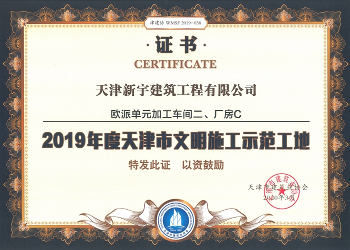 欧派单元加工一间二、厂房c被评为2019年度天津市文明施工示范工地
