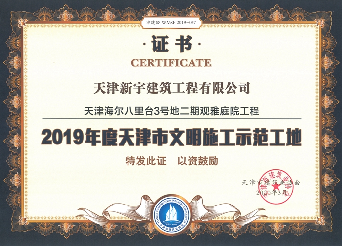 天津海尔八里台3号地二期观雅庭院华体会huatihui(中国)被评为2019年度天津市文明施工示范工地
